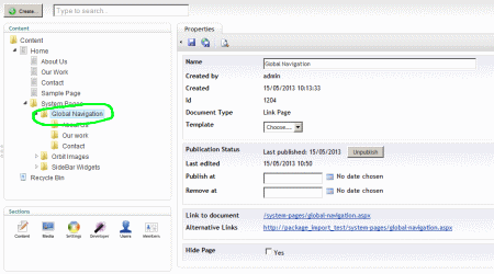 At the bottom right of every page are the 'global navigation links' you can easily customise the links that are shown here in the sitebuilder, but first you need to tell Umbraco where these links are located in the content tree - shown in green